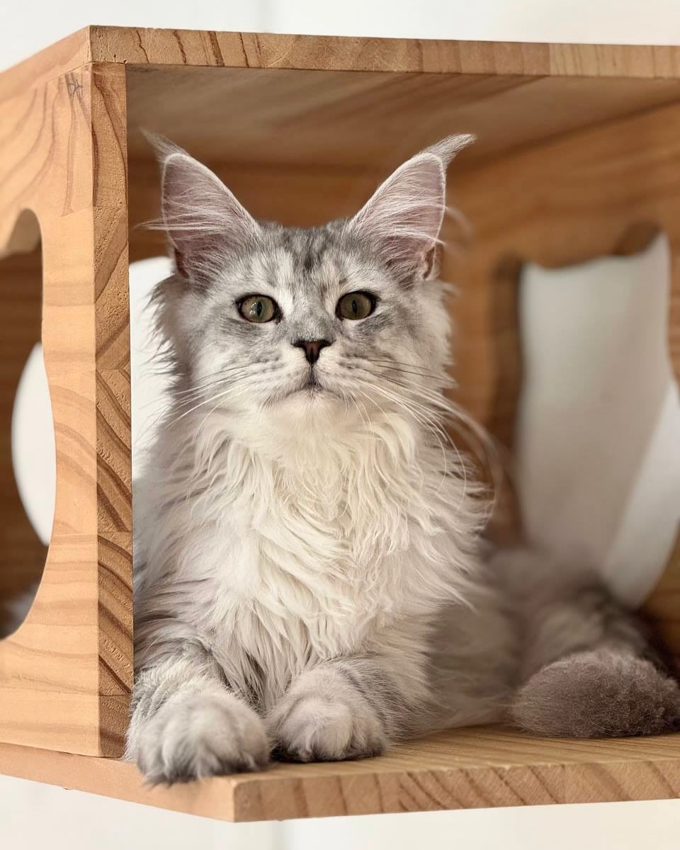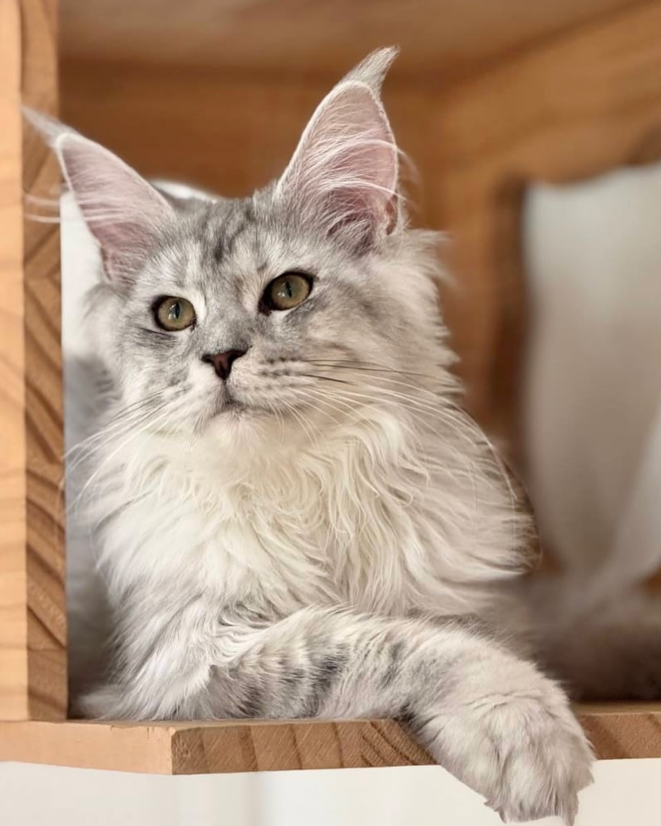 Meet Mireille, a breathtaking silver Maine Coon kitten for sale who embodies elegance in every detail. Â Elegant, tufted ears, luxurious coat & confident gaze. A regal, balanced example of the breed. Her luxurious silver coat shines with a cool, luminous beauty, perfectly complementing her striking features. You will notice her perfectly tufted ears, strong muzzle, and calm, confident gaze immediately. This stunning girl moves with the natural poise and regal presence that defines the classic Maine Coon. Furthermore, her balanced structure and magnificent ruff showcase the breed’s finest qualities. Mireille captures attention with her majestic appearance and graceful movements.